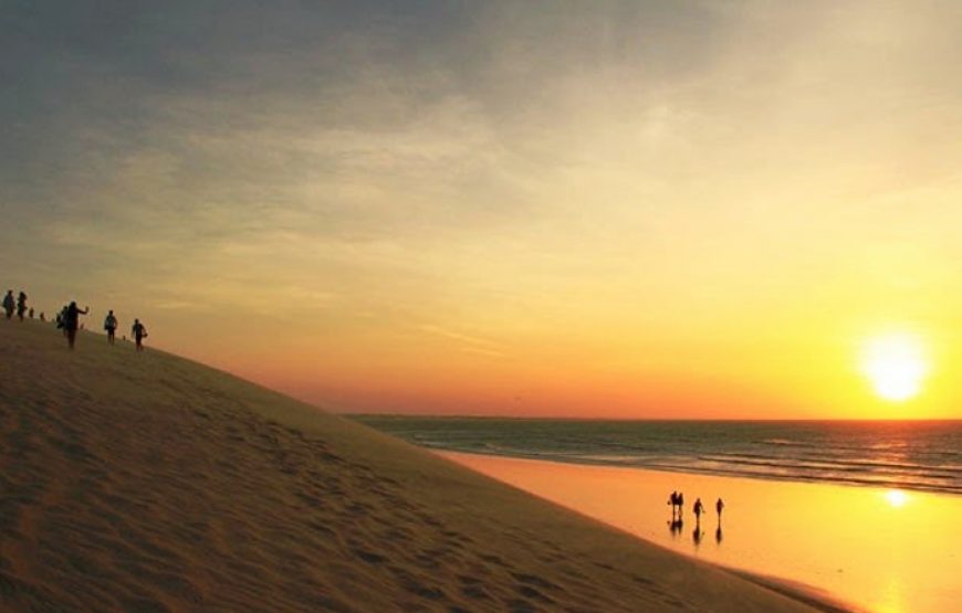 Excursão de um dia a Jericoacoara com saída diária de Fortaleza entre 03h e 04h, incluindo visita à Lagoa do Paraíso, Buraco Azul, Pedra Furada e pôr do sol nas dunas, com guia turístico e taxas de turismo pagas à parte.